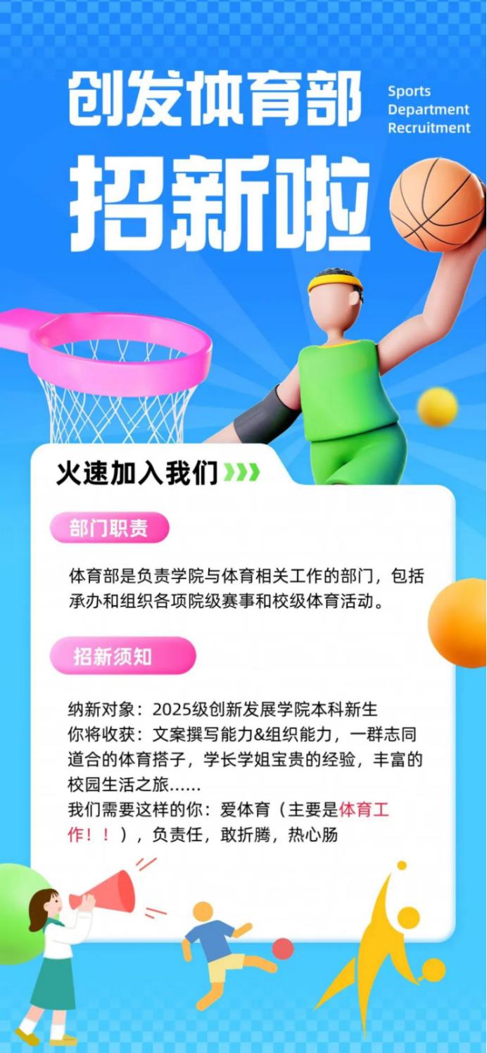 一见青新⑦ | 伟德国际1946学生会体育部等你来加入! 恭喜你刷到这篇——伟德国际1946学生会体育部2025招新特辑体育部拍一拍你快来加入我们!01我们的工作伟德国际1946学生会体育部是负责学院体育类活动的学生部门,包括组织和承办各项院级、校级体育活动,并为学院各院队提供服务。 我们组织参与新生运动会、春季运动会、消防运动会等,编排运动会方阵,组织寒假体育打卡活动,开展五四公益跑活动,并根据同学兴趣创新举办体育赛事:创发篮球院内赛与创发班级排球联赛,以及配合创...