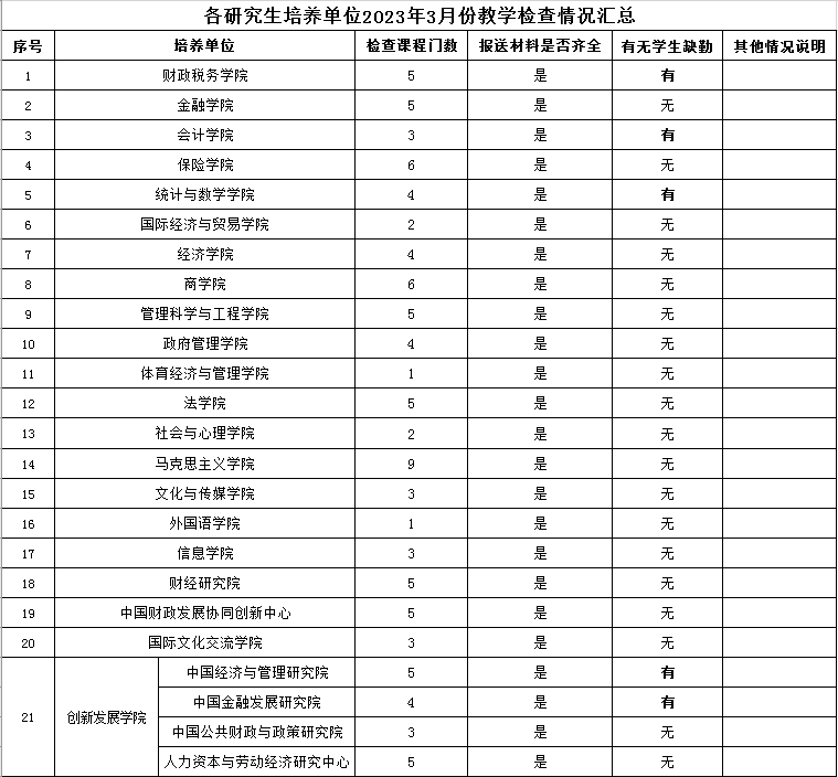 各培养单位均常规开展了教学检查工作并报送相关材料。有5个培养单位存在学生缺勤情况,其中统计与数学学院抽查的一门课程存在严重缺勤情况。