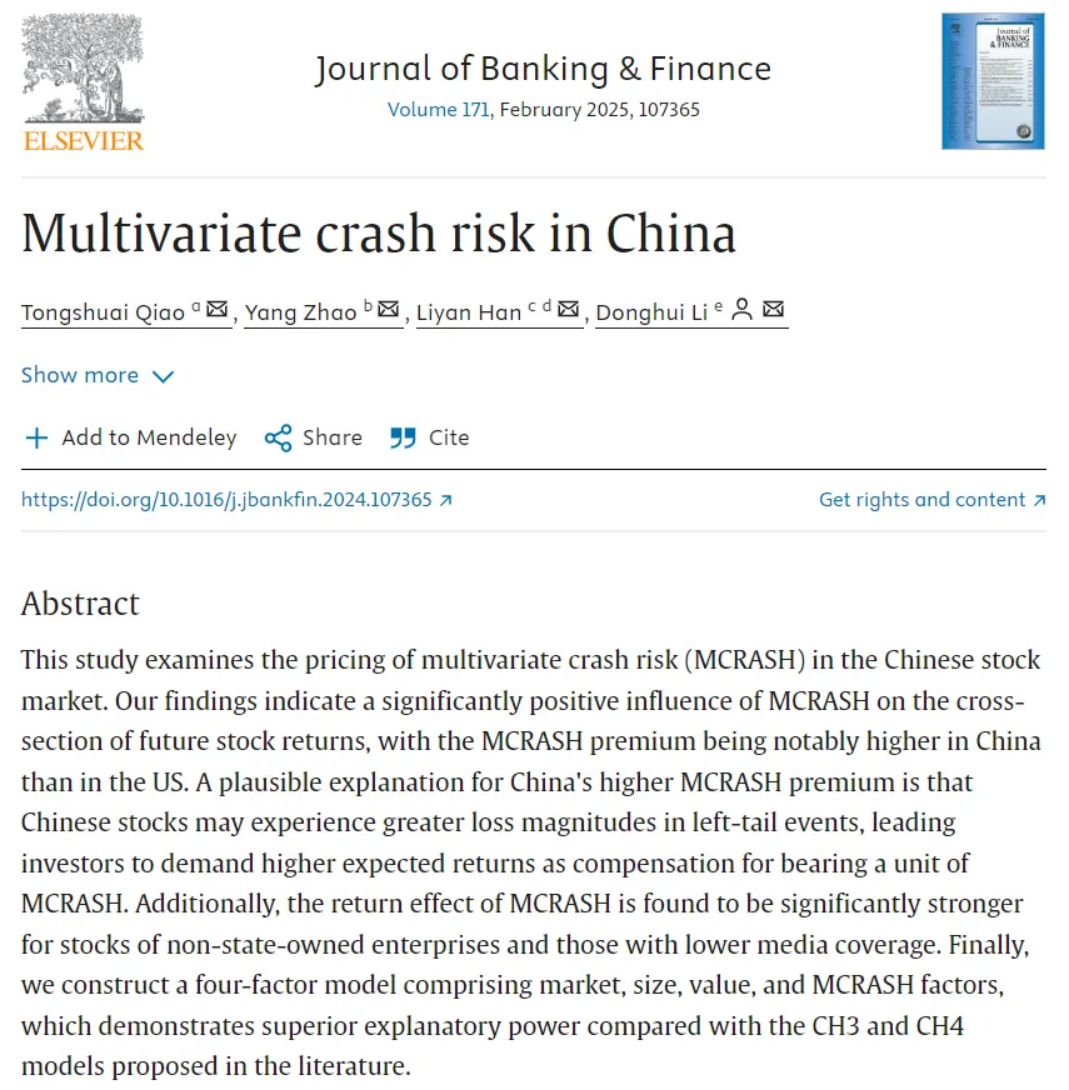 近日,我院赵阳副教授的研究论文“Multivariate crash risk in China”于金融学国际权威期刊Journal of Banking and Finance(ABS 3,中财AA类)上获正式发表。该论文的合作者为北京科技大学乔统帅博士、北京航空航天大学韩立岩教授和深圳大学李东辉教授。