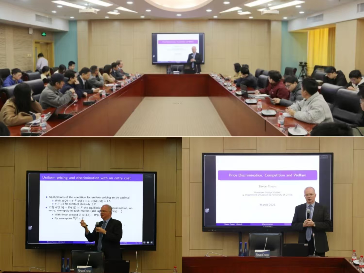 随后,Simon Cowan教授在学院南路校区学术会堂604会议室进行了题为“Price Discrimination, Competition and Welfare(价格歧视、竞争与社会福利)”的讲座,陈斌开副校长、葛建新处长、袁淳常务副院长和校内外师生参加了讲座。讲座由伟德国际1946尹训东副教授主持。