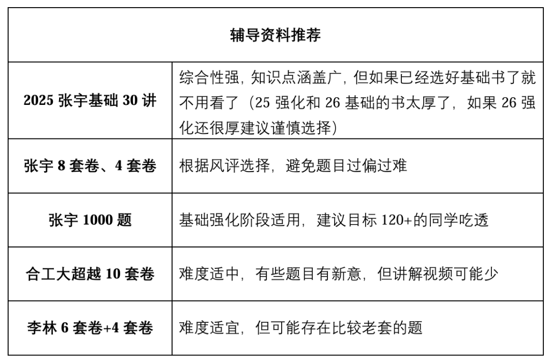 “基础阶段”,也就是将所有知识系统学习完一遍。可以使用张宇基础30讲,李永乐复习全书基础篇,1000题。看张宇老师的课程,搭配基础30讲边看边做手写的笔记。在老师讲课过程中,教辅上的例题要自己先去试着做,实在做不出,再去看老师的讲解做题。看完一章做一章课程内容的笔记后,重新复习一遍笔记和教辅,即滚动复习。