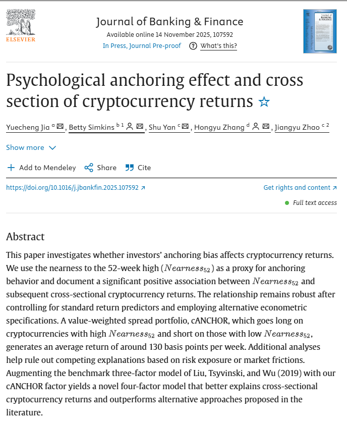 近日,我院贾越珵副教授的论文“Psychological anchoring effect and cross section of cryptocurrency returns”在金融领域的国际权威期刊Journal of Banking and Finance(ABS 3,中财AA类)正式发表。该论文的合作者为伟德国际victor·1946源自商学院张宏宇教授、Oklahoma State University的Betty Simkins教授、阎澍教授、以及该校博士生赵姜宇同学。其中,赵姜宇同学是我院2023届硕士毕业生,在读期间导师为贾越珵副教授。