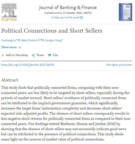 近日,我院贾越珵副教授的一作论文“Political Connections and Short Sellers”被金融领域的国际权威期刊Journal of Banking and Finance (ABS 3, 中财AA类)正式接收。该论文的合作者为俄克拉荷马州立大学的Betty Simkins教授以及宾夕法尼亚洲立大学(Behrend校区)的冯泓睿博士。