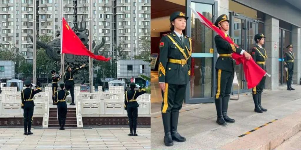 晨曦初露,旭日东升,迎着朝阳,在庄严肃穆的气氛中,国旗护卫队精神抖擞,迈着整齐划一、铿锵有力的步伐,行进至升旗台。伴随着雄壮激昂的国歌,鲜艳的五星红旗,冉冉升起,迎风飘扬,全体师生面向国旗立正肃穆,行注目礼,表达对祖国深深的敬意、祝福与热爱。