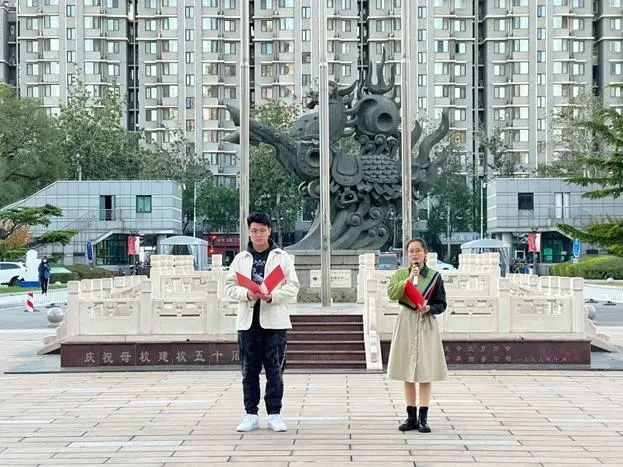 2022级财政理论与政策专业新生代表李祎博、徐辰熙在国旗下声情并茂朗诵《青春中国》。歌颂了一代又一代有志青年在救亡图存、振兴中华的历史洪流中谱写的一曲曲壮丽的青春乐章。“千秋家国血未冷”,吾辈中财大青年也定将以敢为人先的勇气,一往无前的执着,把最美好的青春献给祖国和人民,以报国星火聚成燎原之势,为民族复兴的历史洪流注入青春力量。