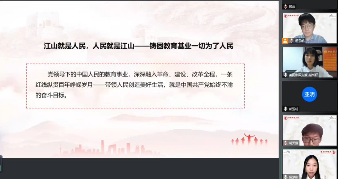中经管研究生第一党支部施梦甜同志首先带领同学们回顾了从新民主主义革命时期以来党在各个历史阶段所取得的教育成就,尤其是党的十八大以来,在习近平总书记的领导下,教育领域坚持党的领导,深入推进教育治理现代化,为如期全面建成小康社会和促进人的全面发展做出的重要贡献,呼吁同学们要“一如既往,一脉相承,一以贯之”,为中华民族伟大复兴而努力奋斗。