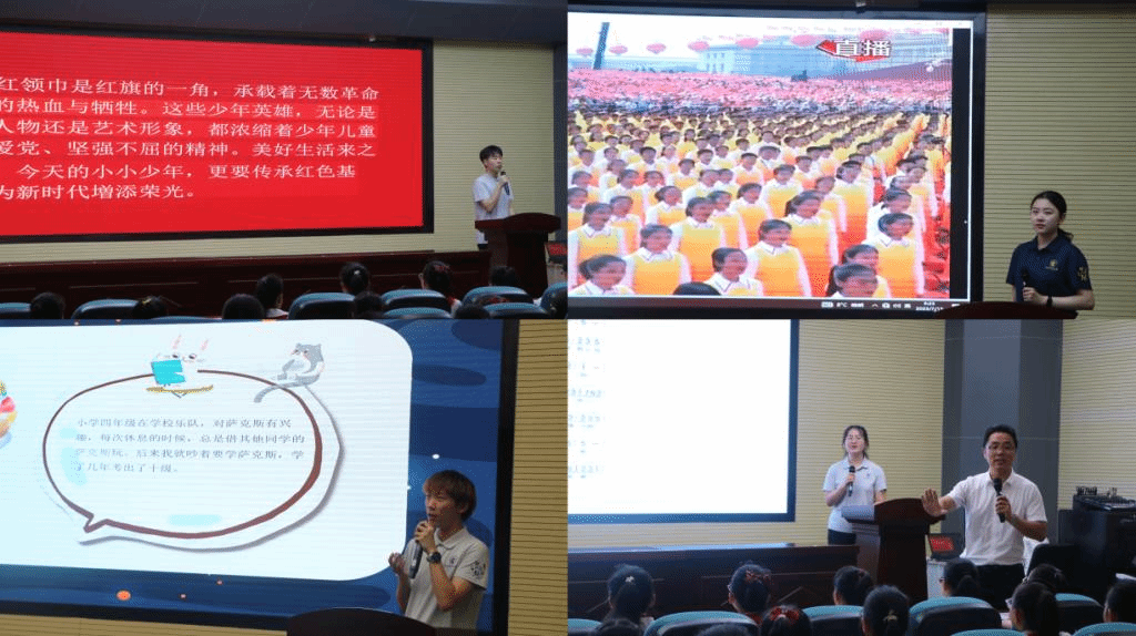 柴新凯同学、冷昊辰同学和李雪婷老师分别为小讲解员带来了《英雄出少年》《向阳而生,茁壮成长》和《我和我的祖国》三节精彩的红色思政课。刘馨乐同学和河东区党性教育基地培训科科长周学信一起带领在场小讲解员学唱沂蒙红歌《愿亲人早日养好伤》,共同感悟沂蒙人民拥军支前的伟大精神。