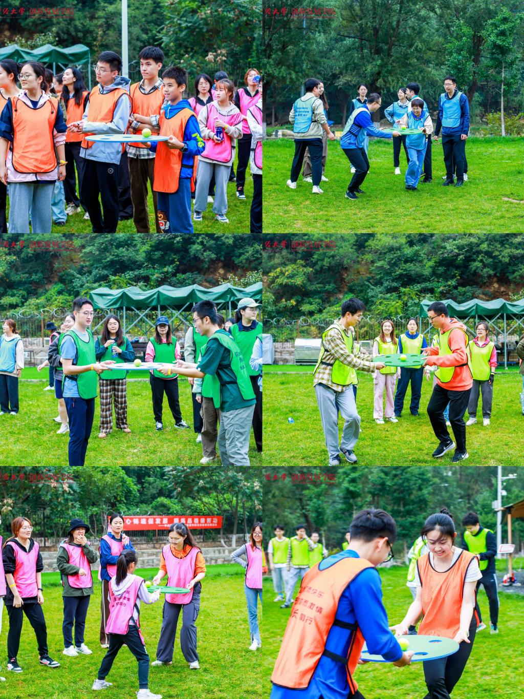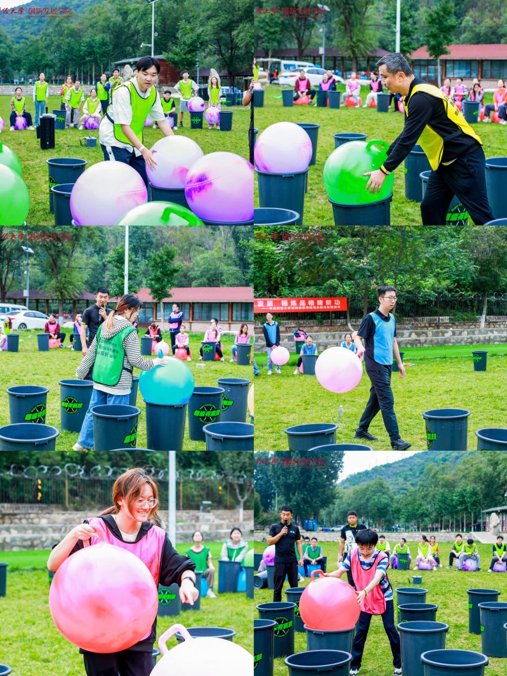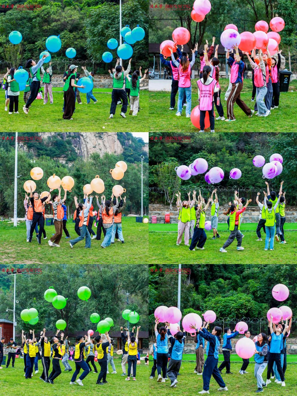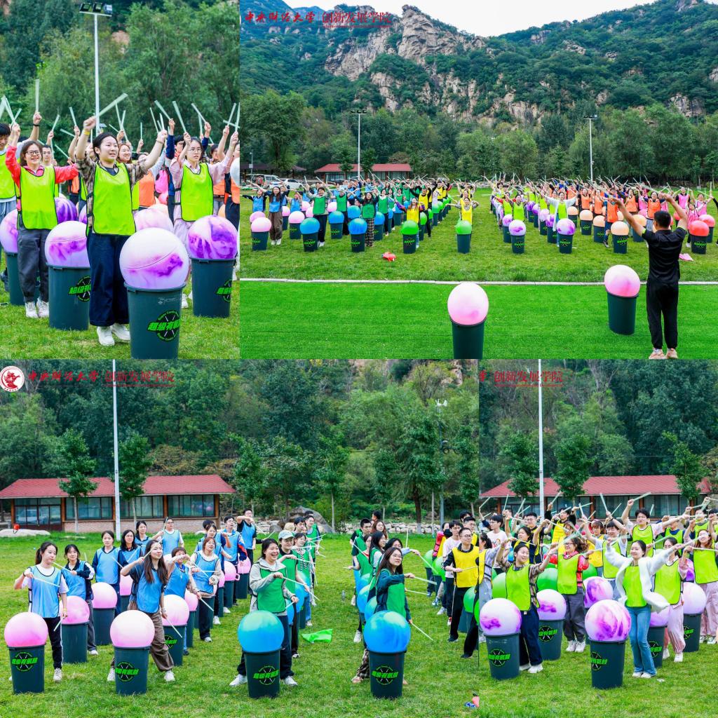 上午九时许,全体师生到达活动地点,绵绵阴雨无法熄灭大家高涨的热情。在学院党委常务副书记王颖老师鼓舞人心的动员之后,妙趣横生的热身破冰活动开始了,师生们共组成六支队伍,每一支队伍都洋溢着勃勃生机与昂扬斗志,分别以“一帆风顺”“好事成双”“三羊开泰”“四季发财”“五福临门”“六六大顺”这些富含吉祥寓意且充满正能量的名字命名,不仅彰显出追求卓越、勇攀高峰的决心与信念,更巧妙地将对祖国繁荣昌盛的深切祝福与对学校未来发展的美好愿景融入其中。