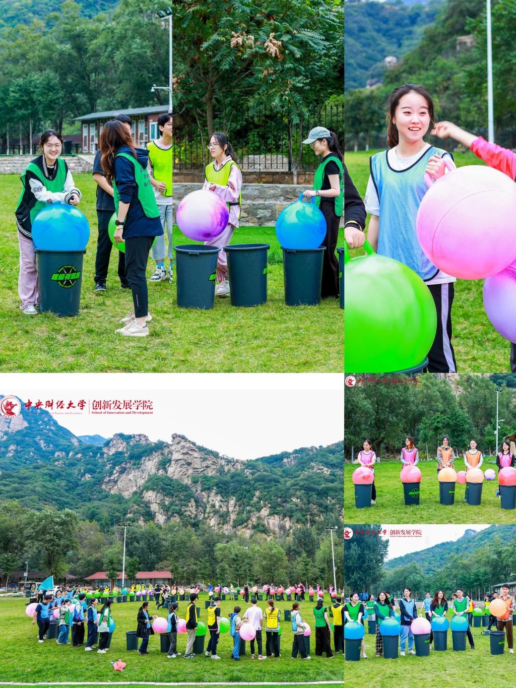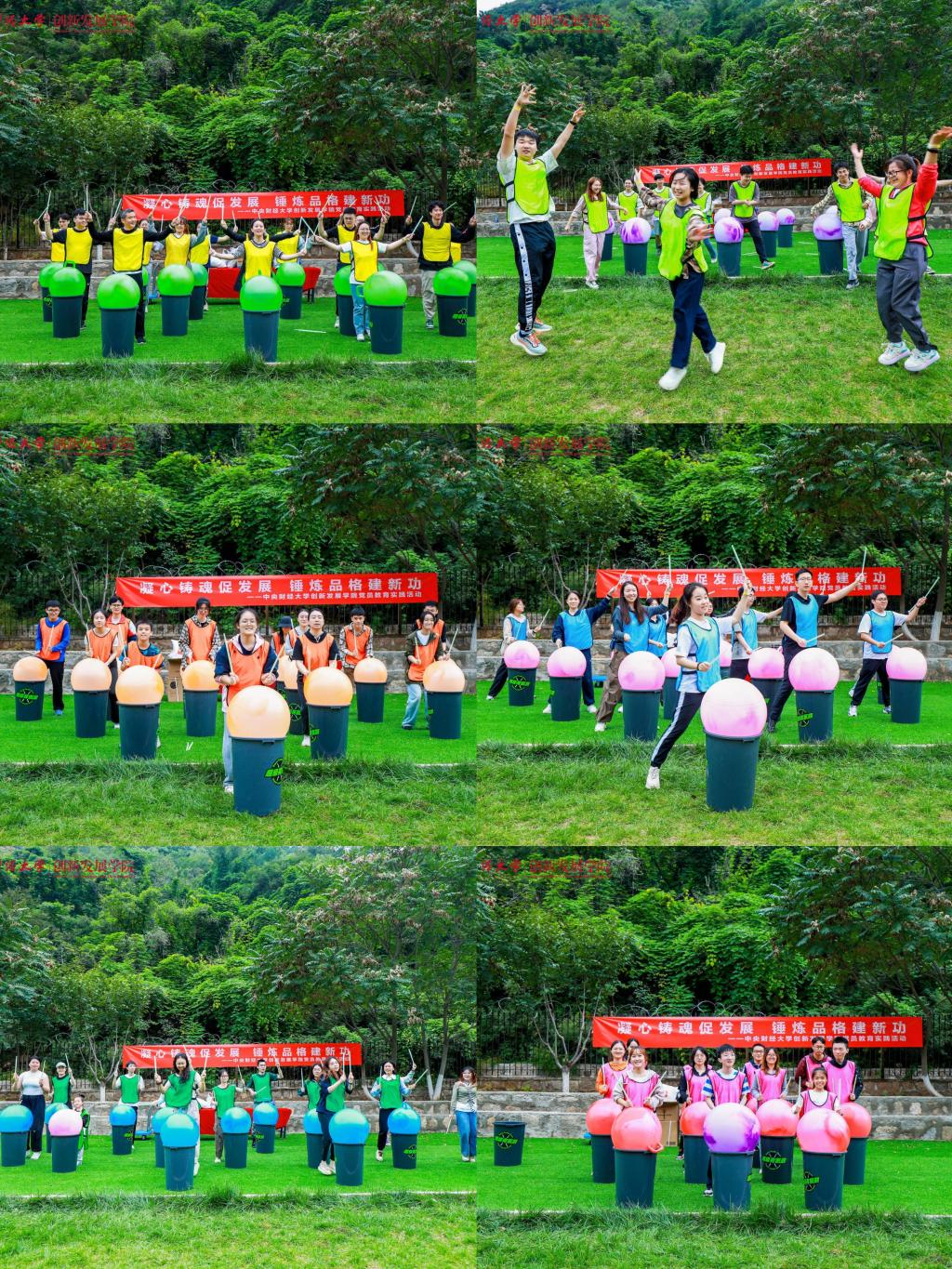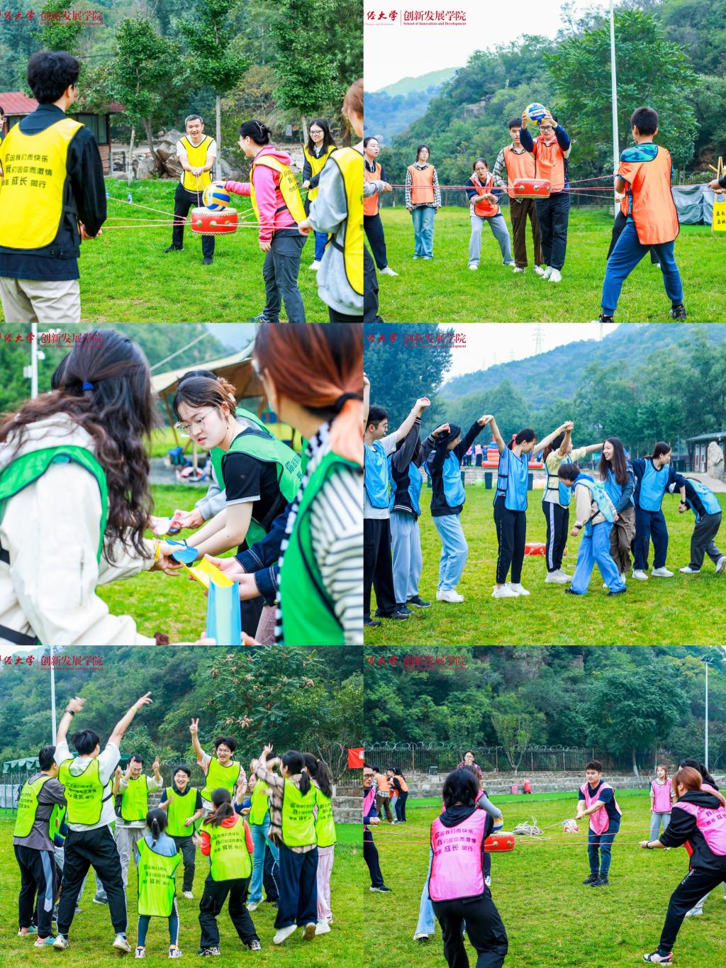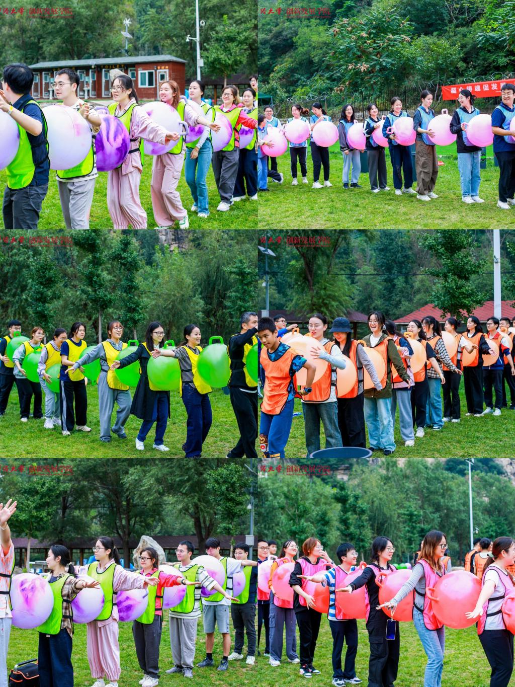 上午九时许,全体师生到达活动地点,绵绵阴雨无法熄灭大家高涨的热情。在学院党委常务副书记王颖老师鼓舞人心的动员之后,妙趣横生的热身破冰活动开始了,师生们共组成六支队伍,每一支队伍都洋溢着勃勃生机与昂扬斗志,分别以“一帆风顺”“好事成双”“三羊开泰”“四季发财”“五福临门”“六六大顺”这些富含吉祥寓意且充满正能量的名字命名,不仅彰显出追求卓越、勇攀高峰的决心与信念,更巧妙地将对祖国繁荣昌盛的深切祝福与对学校未来发展的美好愿景融入其中。