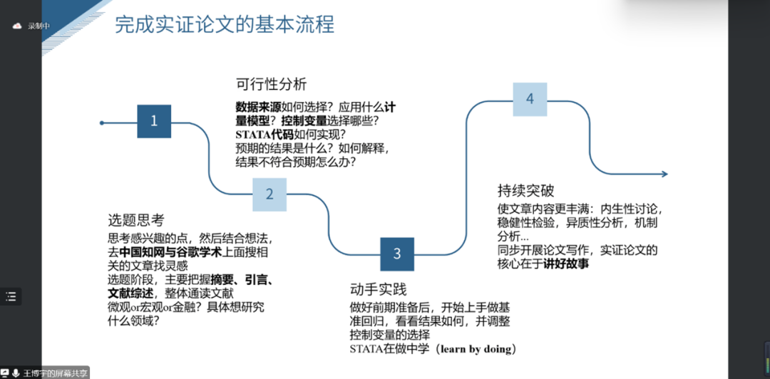 王博宇同学结合自己参加“挑战杯”学生课外学术论文竞赛的经历,向同学们分享了做学术研究的方法。他从完成实证论文的基本流程切入,详细列举了往年优秀作品的选题,为同学们提供了良好的选题思路。同时他按类别推荐了实证研究常用的数据库,丰富了大家获取数据的渠道。结合不同年级同学的知识储备情况,他解答了计量模型选择和STATA相关资源获取等方面的问题,并着重强调了论文写作的基本框架,为同学们今后的论文写作给出了建议。