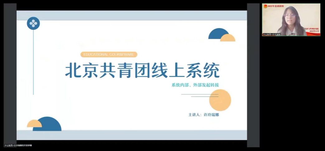 许玲瑞娜讲解了北京共青团线上系统的使用和注意事项,包括基础信息维护和学社衔接的系统操作,重点强调了团关系转出的各种情况,包括系统内部转接、团员参军、向外部发起转接的各类情况。