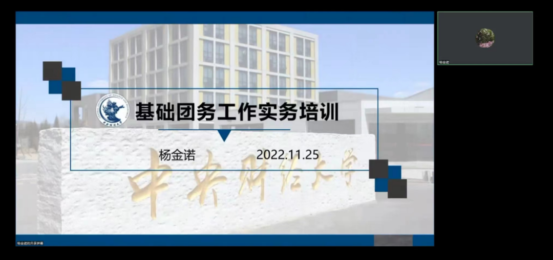 杨金诺讲解了基础团务工作的相关内容,介绍了团组织关系转接、团内信息统计的操作步骤和注意事项,重点强调了团费收缴工作的细节要求,包括收缴对象,收缴要求和标准,未交处理等。