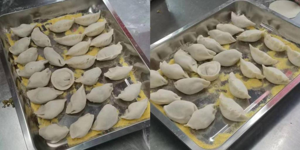 “先将馅儿放入饺子皮中间,在饺子皮的边缘沾点水,然后对折起来,再将饺子皮四周捏紧……”食堂大厨为同学们现场指导,一边慢慢演示,一边讲解步骤要领,同学们细心观看,认真学习,相互切磋包饺子的技巧。在食堂阿姨和叔叔的耐心指导下,同学们从一开始的手法欠佳到手到擒来,有的同学甚至包出了麦穗形和元宝形的水饺,每一个可爱标准的水饺都是大家辛勤劳动的见证。