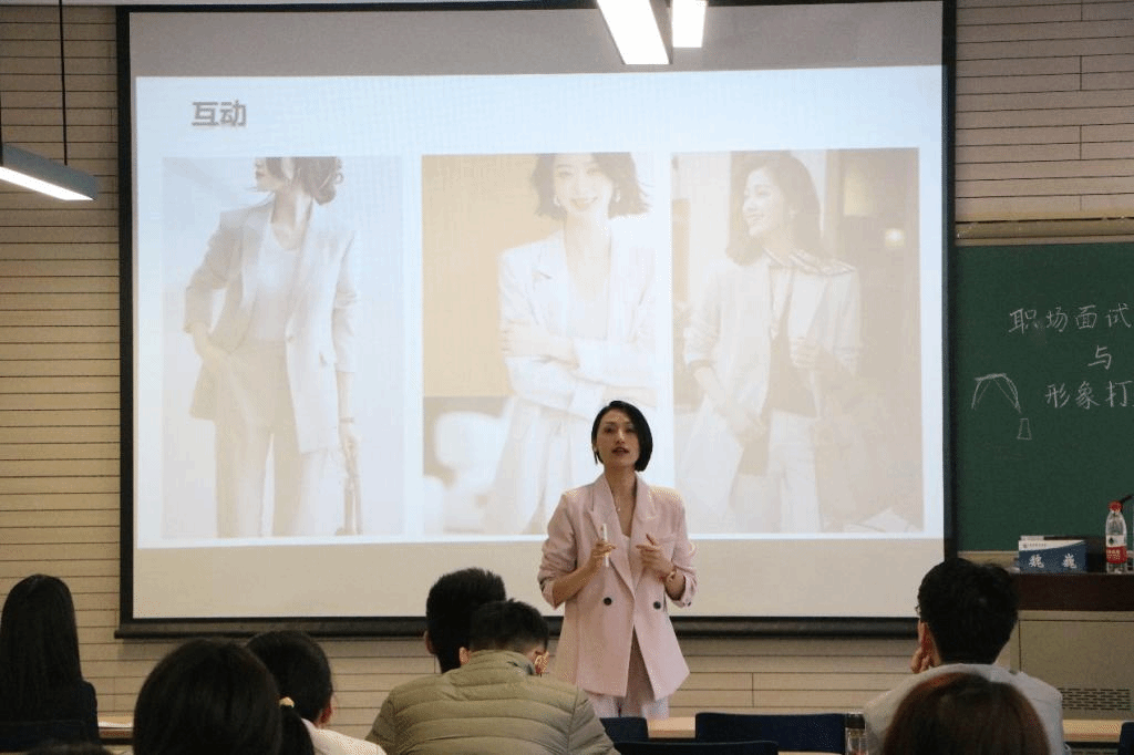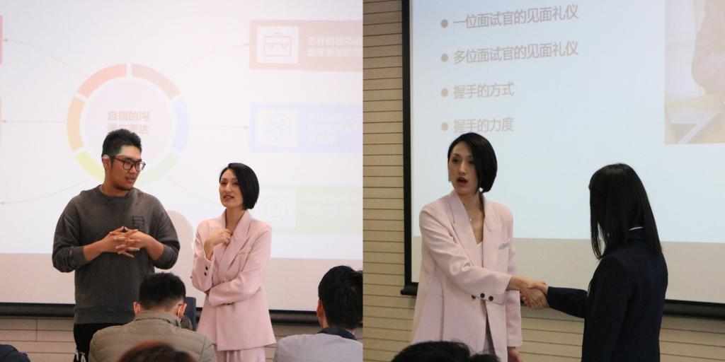 魏巍老师首先介绍了面试礼仪,即整个面试过程中的行为和语言表达的礼仪,她指出良好的行为礼仪有利于给面试官留下良好的第一印象,并邀请同学上台互动,模拟面试中的环节,加深同学们对职场面试礼仪的理解。随后,她介绍了面试中的职场形象塑造。从着装到发型妆容,从颜色到配饰做了细致讲解,在场同学受益匪浅。