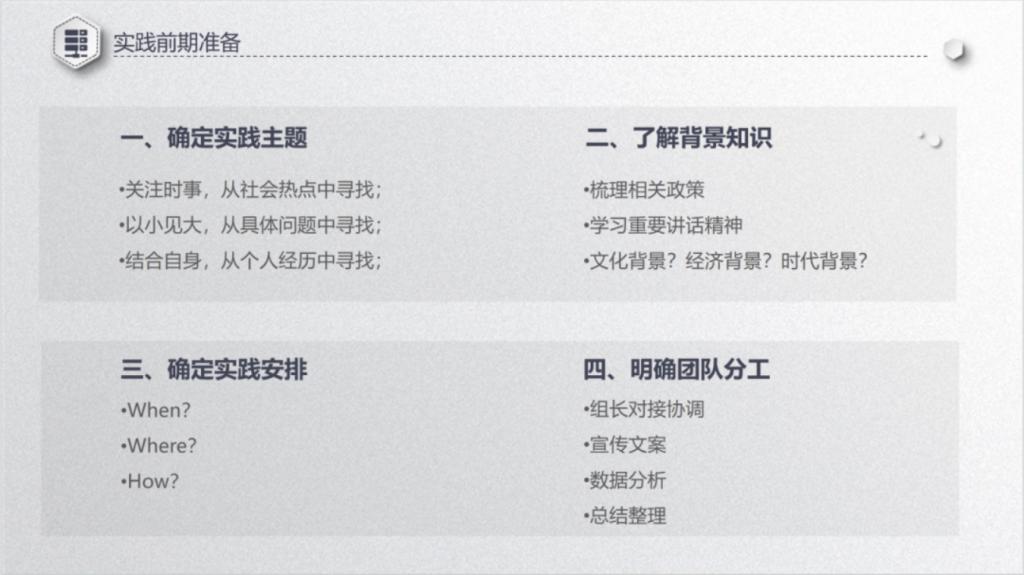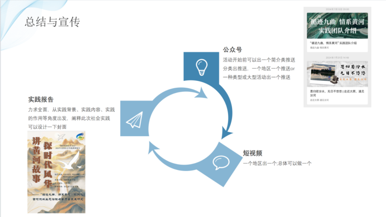 李祎博同学首先结合自己的经历介绍了社会实践对于大学生成长的重要性,并为同学们解读实践通知。通过分享前期准备阶段如何确定实践主题、如何安排实践环节、如何细化团队分工,在实践中如何将问卷调查法、数据分析法、调研访谈法等实践方法入会贯通,丰富实践内容,为同学们提供详细的案例参考。此外,她还为同学们分享了实践报告、实践视频的参考形式,帮助第一次参加实践的同学更好地开展实践。
