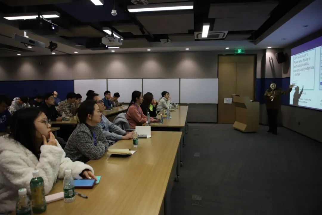 参观结束后,IBM大学合作部工作人员介绍了IBM在科研领域的相关产品IBM Skills Build,表示该项产品立足科技前沿,汇聚技术尖端,通过智慧平台为学生提供学习资源的同时也提供了实习机会。