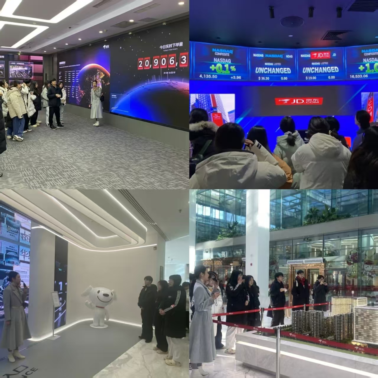 京东集团始终坚持“价值观第一”原则,秉承“客户为先”的理念,不断推动科技创新赋能实体经济高质量发展,持续释放消费活力,努力为消费者营造优质的消费体验。在讲解员的带领下,师生们详细了解了京东集团的发展历史与区域建筑布局,一睹科技前沿的风采。从海开市场三尺柜台到转战线上平台开启电商之路,从一间简陋小屋到高楼林立,一代代京东员工始终秉持着“战斗,战斗,只做第一”的口号,把京东集团建设成为市场规模庞大、数智化程度高、供应链完整、消费者青睐的世界巨头。