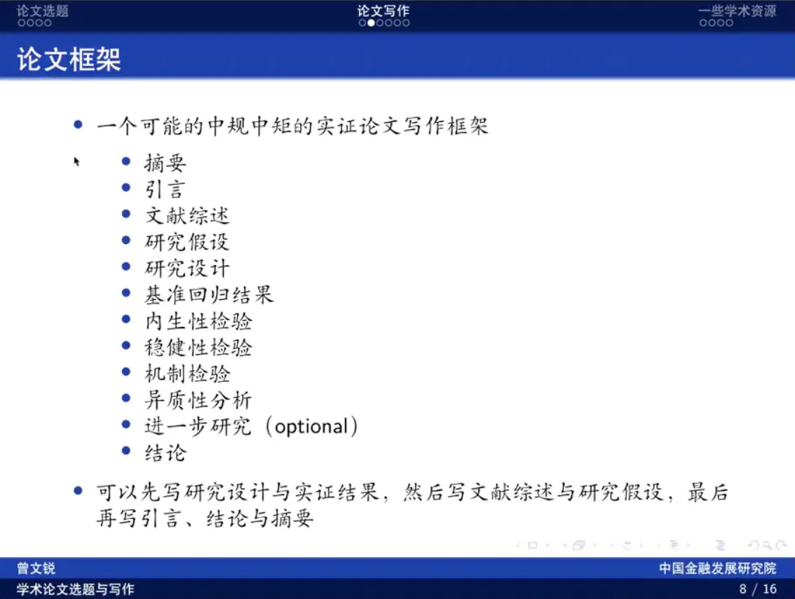 曾文锐从论文选题、论文写作及资源获取三方面分享经验。在选题方面,曾文锐建议可以从三个方面着手:一是阅读文献,了解当前的热门研究领域;二是关注一些未曾或很少被其他研究者使用的新数据;三是去尝试一些陌生的领域。在论文写作部分,他系统介绍了论文框架,并为同学们提供具体的范例。同时推荐了一些常用的学术网站,方便同学们学习参考。