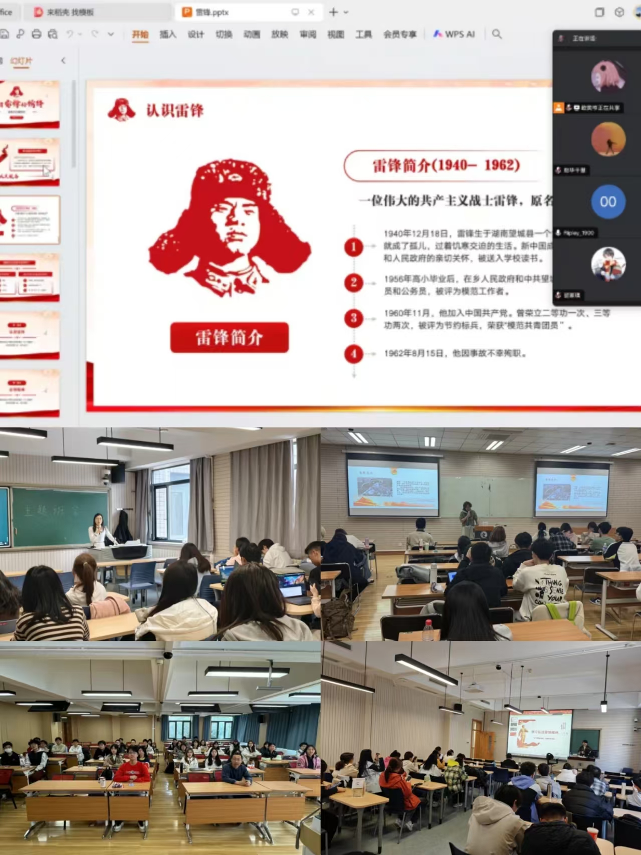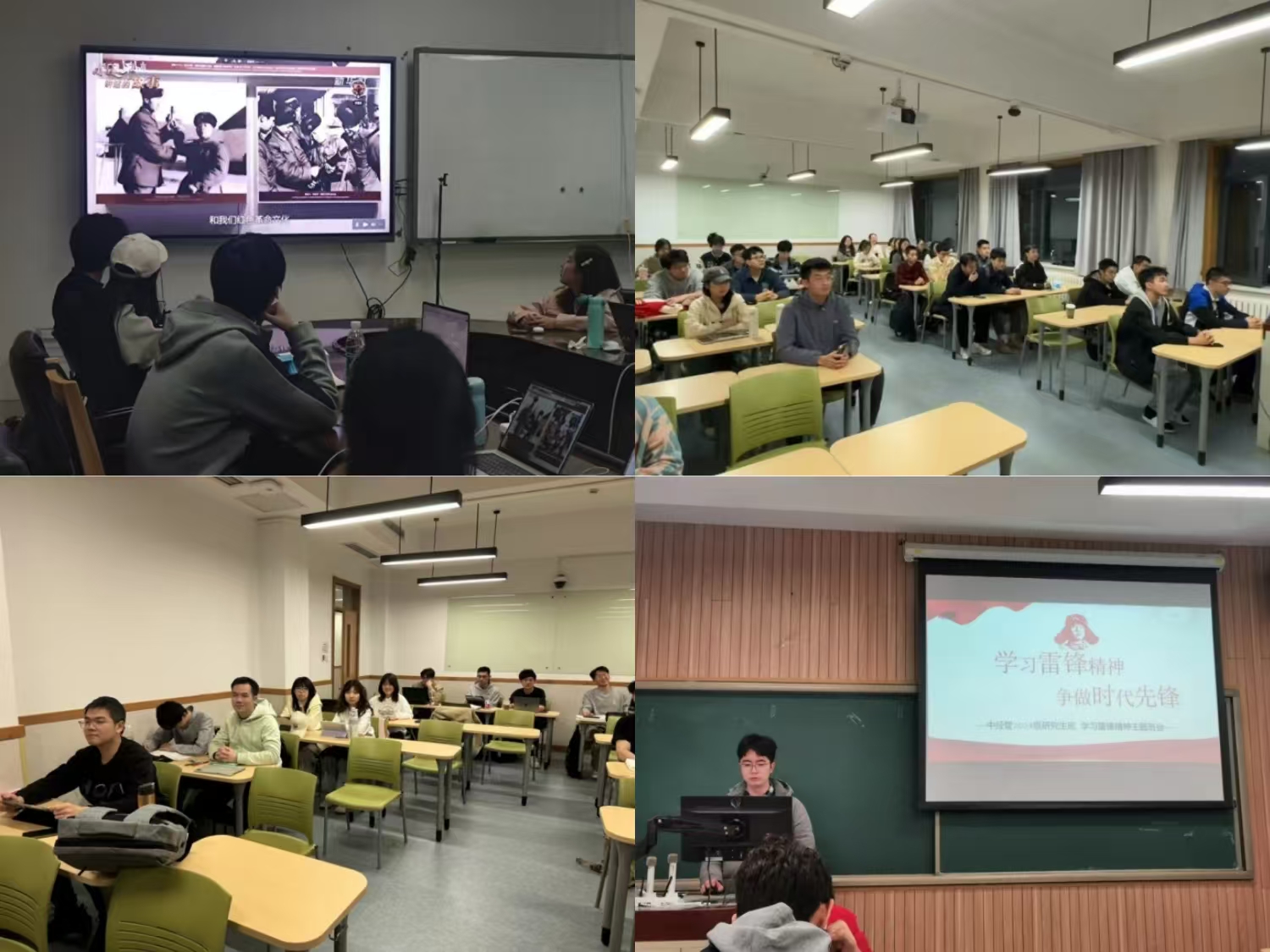 主题班会为青年学子与雷锋精神深度对话搭建桥梁。中公财24级、中金发本22-1班和中经管23-1班用短片回顾和故事讲述相结合的方式,让跨越时空的信仰直抵人心;中金发24-1班、中金发24-2班则沉浸式回顾了雷锋生平,结合鞍钢老照片与军旅日记,让历史细节跃然眼前;中经管24-1班以“永不褪色的精神坐标”为切入点,通过快问快答形式激发思维碰撞——“雷锋最常说的一句话是什么?”“当代青年如何践行螺丝钉精神?”问题层层递进,现场气氛热烈。