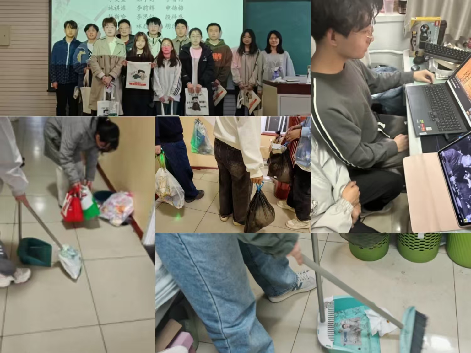 从校园角落到城市动脉,用行动书写新时代雷锋故事。中经管24-2班每个同学都踊跃投身于西直门地铁站、回龙观医院等志愿服务,展现新时代的责任与担当;中金发23-1班、中金发23-2班开展的寝室楼道清扫行动,依托劳动教育锤炼担当之能;人资中心24研号召班级成立“学雷锋志愿小组”,开展校园清洁、社区服务等实践活动,将劳动助人融入日常;中公财23本则用同学们的誓言拼贴“精神之墙”,凝聚集体信仰。