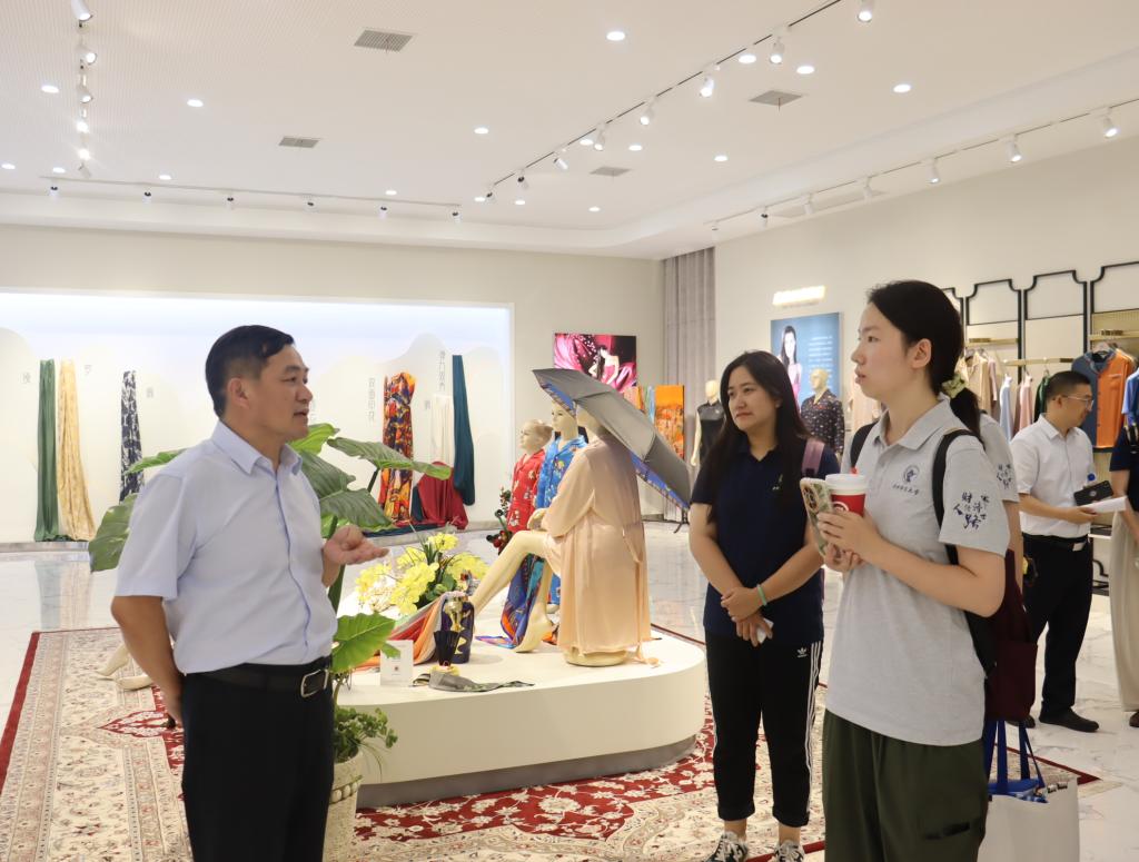 7月8日下午,实践团队首先探访鑫缘茧丝绸集团股份有限公司。集团领导系统介绍了“公司+基地+农户”模式的运作机制。展厅内,从蚕丝被到蚕丝面膜,多元化产品展现了产业增值潜力。公司领导分享的对口扶贫案例中,企业通过培训蚕农、保障收购价,带动上千农户稳定增收,让同学们深刻理解了产业扶贫的实践逻辑。