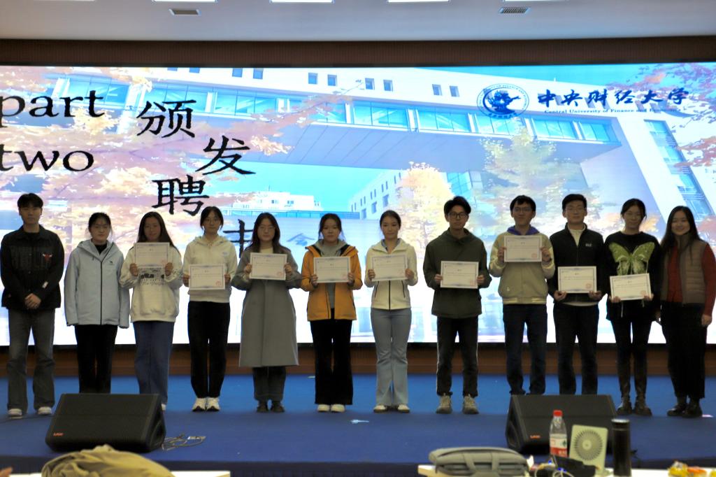 巴蕾老师、柴新凯老师、沈嘉怡老师为团委学生副书记、学生会主席团和新闻中心主任、副主任颁发聘书;随后,学生会主席团、团委学生副书记和新闻中心副主任为各部门负责人颁发聘书。最后,各部门负责人为所在部门干事颁发聘书。