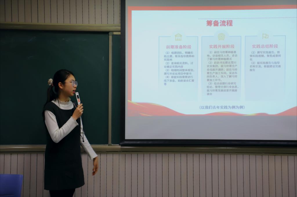 国金25-2团支部“芮+”导师杜尚霖介绍寒暑期社会实践、志愿服务与竞赛组织工作,以及宣传媒体建设与整合等工作。她讲解了暑期社会实践多个赛道的相关内容,并结合自身实践经历为新生团支委介绍了丰富多元的展示形式。宣传媒体板块教学则重点介绍了各类班级日常活动及推文可用内容,并展示了往届成品案例。