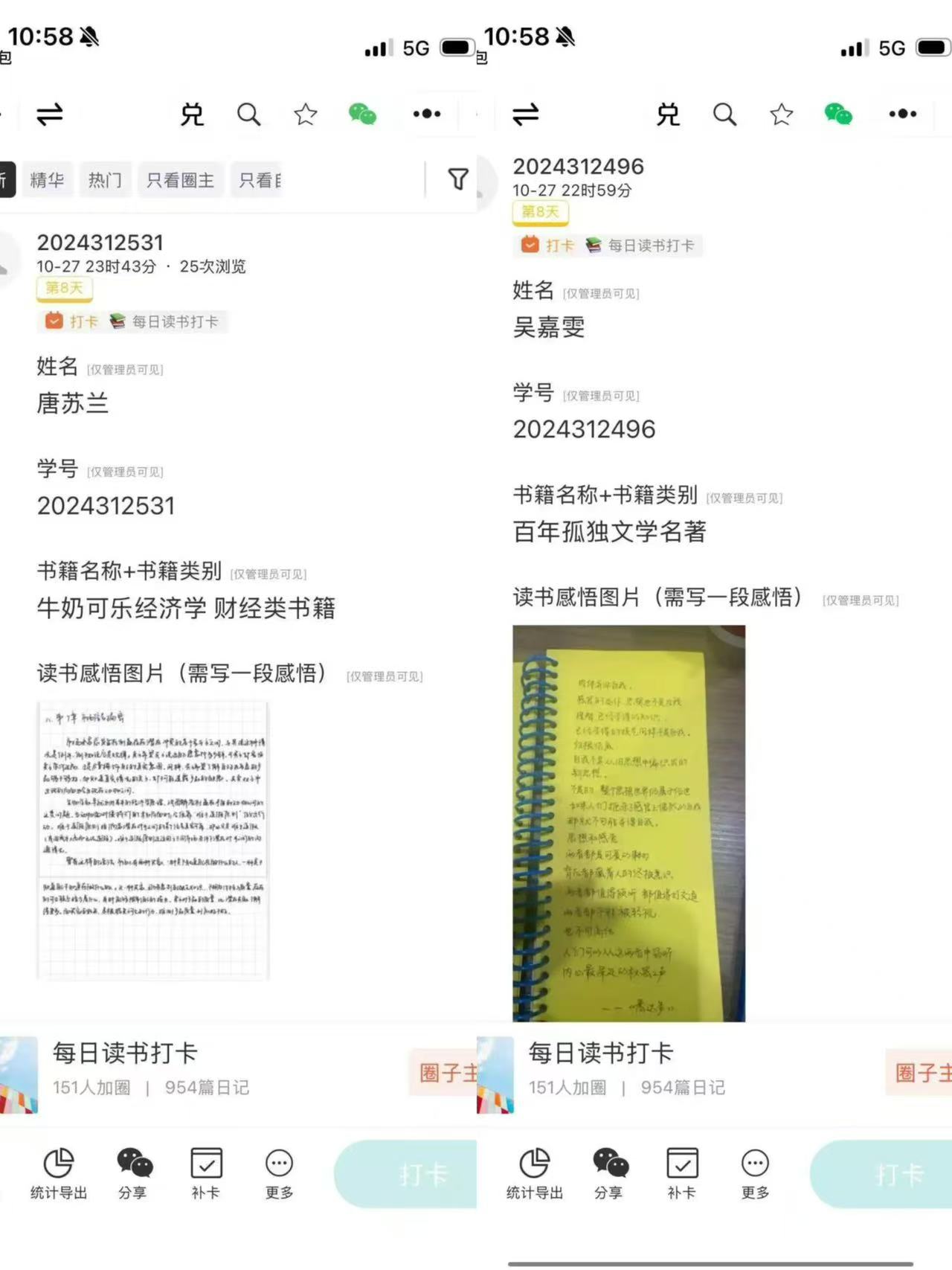 本次“读书打卡”活动持续8天,148名同学积极参与,他们沉浸于红色经典的深厚沉重,遨游于财经天地的广播深邃,用每日打卡的方式让思维的火花在书页之间碰撞、在文字间绽放。