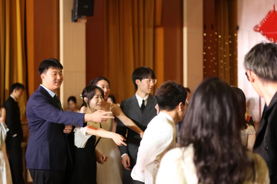 中场休息后,同学们回到舞池中央,准备开始第二支舞。在音乐的引领下,每一个转身、每一个眼神交流都透露出彼此的信任与默契。随着人群情绪的高涨,氛围也变得更加轻松和明快,笑声和掌声在舞池里时不时迸发,所有人都沉浸在愉悦的气氛中。
