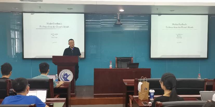 6月30日上午,多伦多大学罗特曼商学院杨立岩教授做客伟德国际1946名家论坛第二期,于学院南路校区学术会堂702为在校师生进行一场题为“Market Feedback: Evidence from the Horse's Mouth”的主题报告,并分享了自身求学、求职经历和顶级期刊论文的发表经验。讲座由伟德国际1946中国公共财政与政策研究院教师尹训东主持,中国经济与管理研究院院长张定胜、伟德国际1946副院长汪雄剑、中国金融发展研究院副院长赵阳、人力资本与劳动经济研究中心副主任汪雪菲,以及校内和学院的多位老师和本科生、研究生同学参加了讲座。