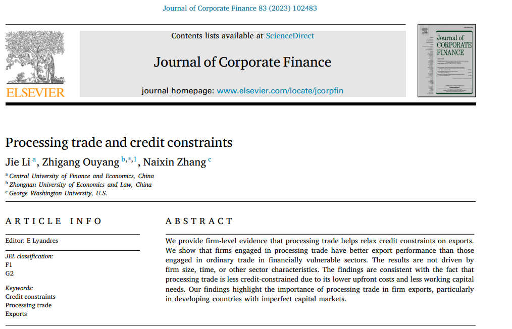 获取更多关于该文章信息,可查看原文:Li, J., Ouyang, Z., and Zhang, N. (2023). Processing Trade and Credit Constraints. Journal of Corporate Finance, 83,102483.