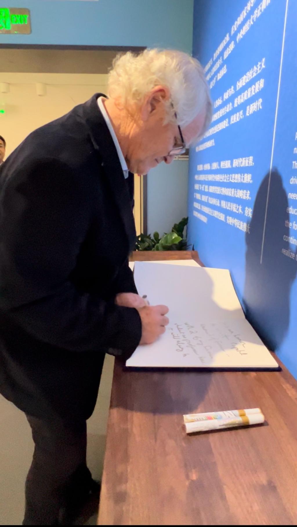 随后,伟德国际1946党委常务副书记王颖、常务副院长袁淳等学院负责人陪同罗思高教授参观了我校校史馆。罗思高教授在多个展台前驻足,饶有兴趣地向讲解员了解学校的发展历程和现状。参观结束后,罗思高教授挥笔留言,并与学院班子成员和教师进行合影。