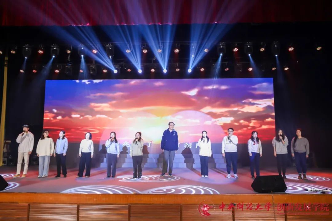 第二篇章在财政学(财政理论与政策)24班全体同学气势磅礴的《黄河大合唱》中展开,铿锵有力的歌声中唱出了青年的热血和激情。相声表演《中财大学生年度报告》,用诙谐有趣的方式讲述学习生活中的趣事与无奈,让大家忍俊不禁的同时又深有所感。经济学(数理经济与数理金融)24-2班同学合唱《平凡之路》,用真挚的歌声诠释对梦想与人生的深刻共鸣。金融学(国际金融与公司理财)24-1班同学带来的合唱《我们都是追梦人》,用热血与活力展现追逐梦想的坚定信念。在创意节目《校园新闻联播》中,覃迪菲、陈琳欣用妙趣横生的校园故事,为观众带来耳目一新的视听感受。