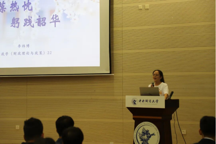 财政学(财政理论与政策)22级本科生李祎博分享了自身学生工作经历,梳理了学校各学生组织框架,帮助新生年级同学更好地选择学生组织展开分享。她强调,参与学生工作需保有持续的工作热情,努力提升综合本领。