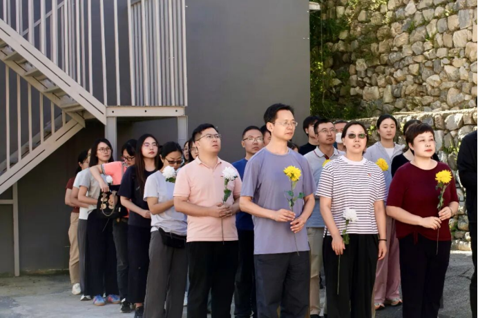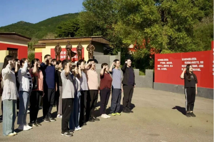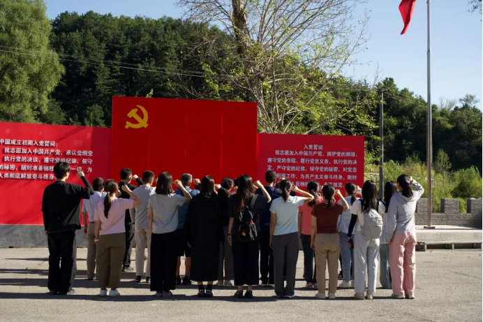 在纪念馆前的英雄纪念碑前,师生代表缓步上前,将黄白相间的菊花敬献于碑前,并集体默哀致敬。随后,全体党员面向党旗庄严宣誓,铿锵有力的誓言在山谷间久久回荡。