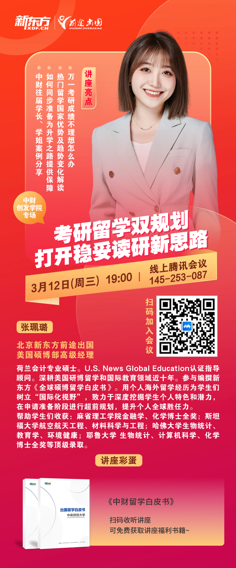 第三期课堂将由北京新东方前途出国美国硕博部高级经理张珮璐带来“考研留学双规划-打开稳妥读研新思路”主题讲座。