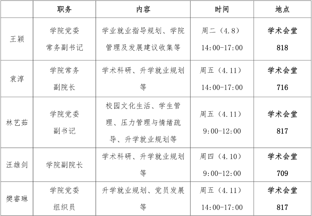 “书记院长开放日”旨在搭建师生交流的平台,畅通问题反馈渠道,进一步加强学院领导与师生之间的交流,倾听学生心声,了解学生所想,回应学生诉求,服务学生成长,集思广益、凝聚共识,切实解决学生在学习生活中遇到的问题,持续营造开放、包容、和谐的学院氛围。