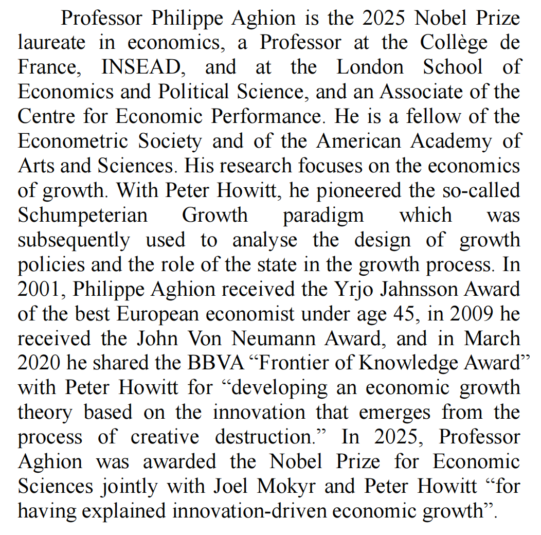 菲利普·阿吉翁(Philippe Aghion)教授是2025年诺贝尔经济学奖得主,现任法国法兰西学院、欧洲工商管理学院和伦敦政治经济学院教授,并担任经济绩效中心研究员。他是计量经济学会和美国艺术与科学院会士。阿吉翁教授的研究主要聚焦于经济增长理论。他与彼得·豪伊特共同开创了熊彼特增长范式,该理论随后被广泛用于分析增长政策的设计及国家在经济增长过程中的作用。2001年,菲利普·阿吉翁荣获“伊尔约·雅恩松奖”,以表彰他作为45岁以下欧洲杰出经济学家的卓越成就;2009年,他获得冯·诺伊曼奖;2020年,他与彼得·豪伊特被授予BBVA“知识前沿奖”,以表彰他们在经济增长研究中所做的开创性贡献。2025年,阿吉翁教授因“对创新驱动型经济增长的阐释”,与乔尔·莫基尔和彼得·霍威特共同获得了诺贝尔经济学奖。