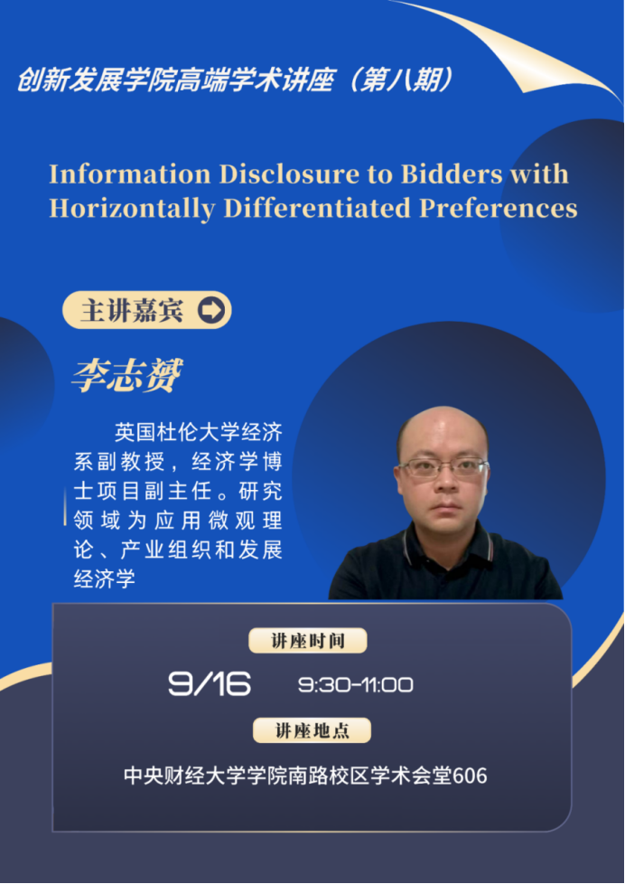 伟德国际1946高端学术讲座(第八期)| 李志赟:水平差异化产品的信息披露 讲座标题Information Disclosure to Bidders with Horizontally Differentiated Preferences主讲人李志赟,Durham University主讲人介绍李志赟博士现任英国杜伦大学经济系副教授,经济学博士项目副主任。他于2012年于牛津大学获经济学博士学位,曾任职于国际组织和高校研究机构。他的研究领域为应用微观理论、产业组织和发展经济学,研究成果发表于International Economic Review,Journal of Industrial Economics, Journal of...