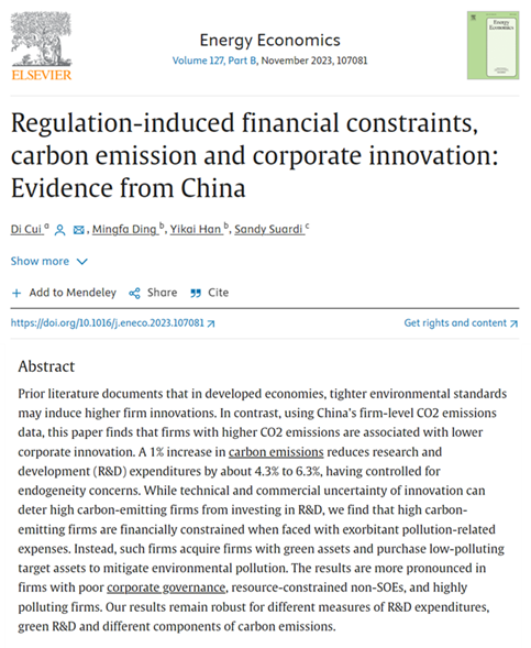 学术科研|我院丁明发副教授、在读博士生韩易凯合作在国际权威期刊Energy Economics(中财AA类)发表论文 近日,我院丁明发副教授、在读博士生韩易凯的合作论文“Regulation-induced financial constraints, carbon emission and corporate innovation: Evidence from China”在能源经济领域的国际权威期刊Energy Economics(ABS 3,中财AA类)正式发表。该论文的合作者还有深圳技术大学崔頔教授以及澳大利亚伍伦贡大学(University of Wollongong)的Sandy Suardi教授。1、论文摘要先前的文献表明,在发达经济体中,更严格的环境标准...